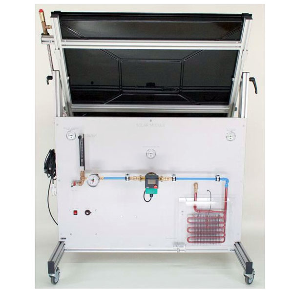 Gerätebeschreibung:Das Funktionsmodell Solarkollektor kann zur Erklärung des grundsätzlichen Funktionsprinzips eines Solarkollektors und dessen Verwendung innerhalb einer Brauchwasserversorgungsanlage genutzt werden. Über die einfache Demonstration hinaus, erlaubt die messtechnische Ausstattung des Funktionsmodells auch die Durchführung quantitativer Versuche.Die physikalischen Grundsätzlichkeiten, die zur fachlich korrekten Planung eines Solar-Brauchwasser-Erwärmungssystems bekannt sein sollten, können in praktischen Versuchen (Wirkungsgrad, zu erwartende Wärmeleistung, Berechnung von Energieströmen aus Temperaturdifferenzen und Massenströmen usw.) gezeigt werden. Die Anlage besteht aus einem geschlossenen Solarkollektorkreislauf, dessen über den Kollektor aufgenommene Wärmemittels eines Wärmetauschers an ein Brauchwasserreservoir abgegeben wird. Die durch eine Umwälzpumpe bewirkte Zirkulation kann an einem Durchflussmesser mit Drosselventil eingestellt und abgelesen werden. Auf einer Kunststoffschichtplatte sind - außer schwenkbarer Solarkollektor - alle zum System gehörigen Komponenten aufgebaut. Bauteilbezeichnungen und Funktionshinweise sind in die Trägerplatte graviert.SOLARKOLLEKTOR: