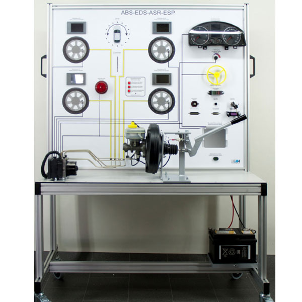 Der Schulungsstand erlaubt die Demonstration eines Beschleunigungsvorgangs bei mangelnder Traktion an der Antriebsachse. Fahrbarer Schulungsstand mit funktionsbereitem Aufbau eines original ABS -ESP MK 60-Systems. Durch eine vorhandene Spezialelektronik können die fahrdynamischen Verhältnisse beim Beschleunigen und Bremsen eines Fahrzeuges sehr realitätsnah gezeigt werden.