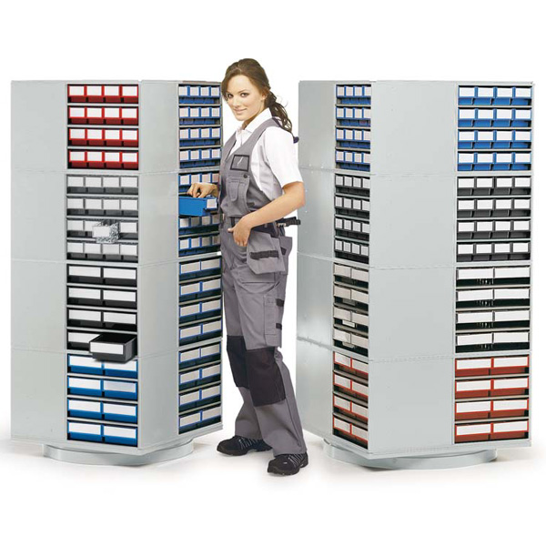 Der Drehständer kann 16 frei wählbare Kleinteilemagazine aufnehmen, welche separat bestellt werden müssen