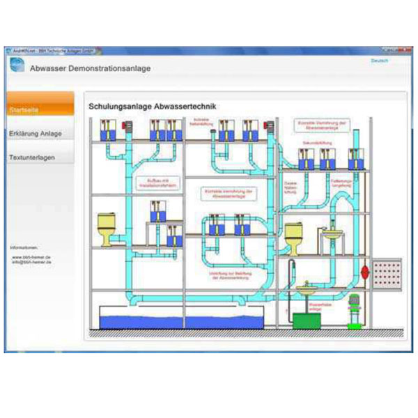 Das Programm ermöglicht die interaktive Erklärung eines Abwassersystems. Jede Spülstelle kann betätigt und der Spülverlauf verfolgt werden. Typische Fehler (Einspülungen in Rohrleitungen) werden sichtbar. Besondere Anlagenteile (Belüftungsarten, Installationsfehler, usw.) werden gesondert behandelt. Das Programm kann alternativ zu einer Originalanlage für die Einführung in die Abwassertechnik verwendet werden.